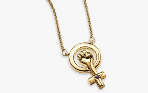 Κοιτάζοντάς πιο προσεκτικά το χρυσό κρεμαστό κολιέ της Meghan, βλέπουμε ότι συνδυάζει το σύμβολο της Αφροδίτης με μία γροθιά, την οποία στολίζει μια μοβ πέτρα αμέθυστου που σχετίζεται με τη φώτιση.