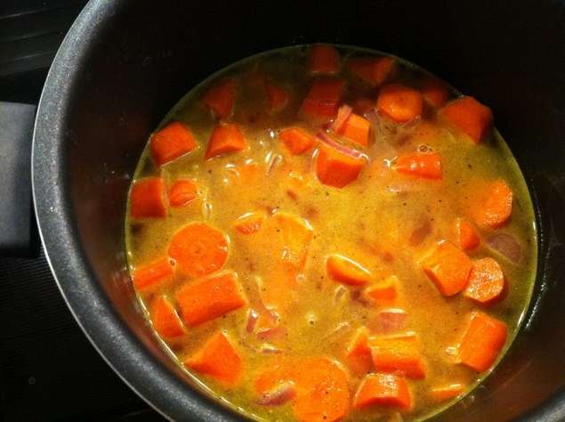 Το αφήνουμε λίγο να εξατμιστεί και προσθέτουμε τα κομμένα καρότα.