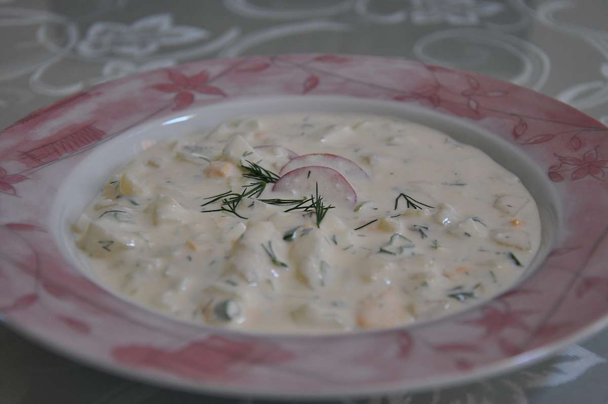 Υλικά:1 κιλό γιαούρτι στραγγιστό 2 ποτήρια νερό 10 ραπανάκια ψιλοκομμένα σε κύβους ή εναλλακτικά 2 ξινόμηλα 6 αυγά βραστά ψιλοκομμένα σε κύβους ½ ματσάκι φρέσκα κρεμμύδια ψιλοκομμένα ½ ματσάκι φρέσκο άνηθο ψιλοκομμένο 1 αγγούρι ψιλοκομμένο σε κύβους 3 πατάτες βραστές ψιλοκομμένες σε κύβους Λίγο λάδι και αλάτιΕκτέλεση: Ανακατέψτε πολύ καλά το νερό με το γιαούρτι χρησιμοποιώντας ένα mixer, για να ομογενοποιηθεί το μίγμα. Αφού ετοιμάσετε όλα τα υπόλοιπα υλικά, ενώστε τα με το αραιωμένο γιαούρτι και η γιαουρτόσουπα είναι έτοιμη. Μπορείτε να σερβίρετε τη σούπα με κρουτόν.Tips:- Τα αυγά και οι πατάτες πρέπει να είναι κρύα όταν θα τα κόψετε σε κύβους ώστε να μην αλλάξουν σχήμα όταν τα ενώσετε με το γιαούρτι.