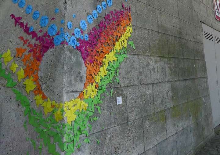 Έχουμε πολλές φορές δει paper art ή street art σε δρόμους μεγάλων πόλεων. H Mademoiselle Maurice τα συνδυάζει και τα δύο με το δικό της τρόπο. Τα urban installations με την τεχνική origami μπορεί κανείς να τα δει στους δρόμους της πόλης του φωτός να διακοσμούν τοίχους και πεζοδρόμια σαν πολύχρωμα ουράνια τόξα.