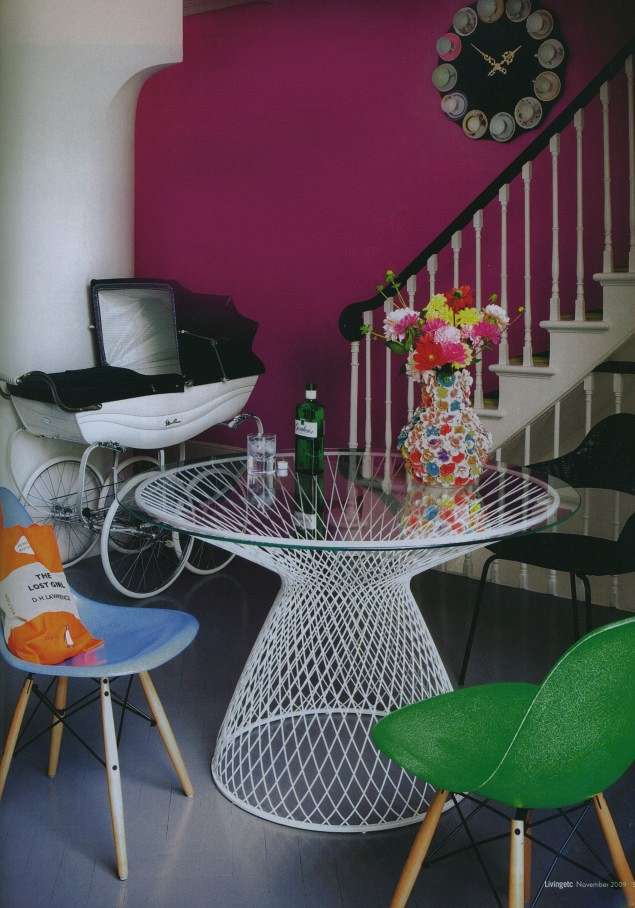 Ένα 50's living room σε μοντέρνα εκδοχή: Ρολόι από κινέζικα φλιτζάνια τσαγιού, neon χρώμα στους τοίχους και vintage καρότσι για το μωρό. Παρατηρήστε τις παράτερες καρέκλες που χαρίζουν μία πιο mix&match άποψη στο χώρο.