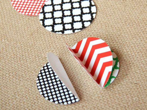 Κόψτε τα σε τέλειους κύκλους και συνδυάστε διάφορα σχέδια μεταξύ τους. Κολλήστε εντελώς δύο ημικύκλια πάνω στην βάση με ταινία διπλής όψεως και κολλήστε ένα άλλο μόνο στη ράχη του ώστε να προεξέχει. Κόψτε λεπτές κορδέλές και δημιουργήστε κομψούς φιόγκους τους οποίους θα τους κολλήσετε πάνω στις χάρτινες μπάλες της κάρτας σας. Πηγή: http://blog.hgtv.com