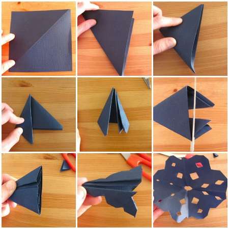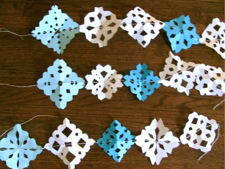 Κόψτε τα χαρτιά σε σχήμα χιονονιφάδας. Πάρτε ένα τετράγωνο χαρτί και διπλώστε διαγώνια ώστε να σχηματίσετε ένα τρίγωνο, διπλώστε για να κάνετε μικρότερα τρίγωνα άλλες δύο φορές . Κάντε διάφορες ψαλιδιές στις άκρες του τριγώνου και η χιονονιφάδα σας είναι έτοιμη. Συνεχίστε και με τα υπόλοιπα χαρτιά.