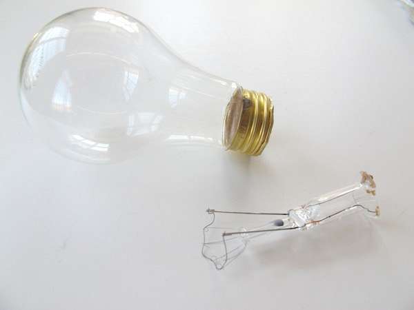 Φορώντας τα γάντια, κρατήστε προσεχτικά τη λάμπα, γιατί είναι εύθραυστη, ξεκολλήστε την ασημένια φλούδα που έχει στη βάση. Στη συνέχεια προσπαθήστε με αργές κινήσεις και με την βοήθεια της πένσας να σπάσετε το κάτω μαύρο μέρος ώστε να αφαιρέσετε τον λαπτήρα από μέσα. ΠΡΟΣΟΧΗ πολύ εδώ, εάν δεν νιώθετε σίγουροι ότι μπορείτε να το κάνετε ζητήστε βοήθεια ή σταματήστε το project. Καλύτερα να το κάνετε σε εξωτερικό χώρο.