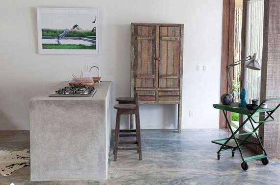 Έπιπλά χτισμένα από τσιμέντο, ακατέργαστο ξύλο και πήλινα αγγεία του Βραζιλιάνικου πολιτισμού συνθέτουν το σκηνικό στην υπέροχη αυτή μίνιμαλ οικία στο Ρία ντε Τζανέιρο. Μεγάλα ανοίγματα ώστε η δροσιά να βρίσκει το δρόμο της.Φανταστικές ιδέες διακόσμησης με έμπνευση από τη Βραζιλιάνικη φύση
