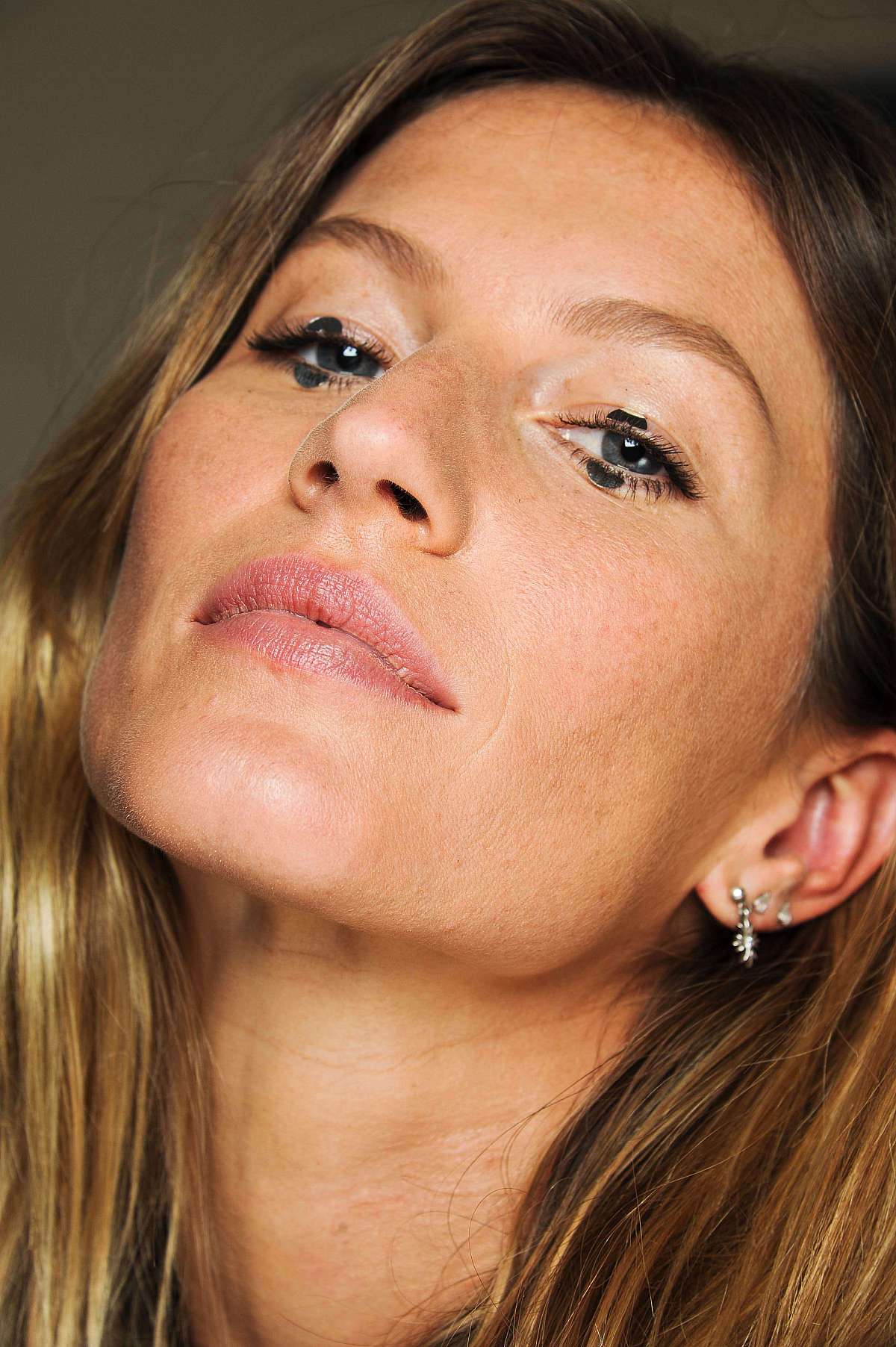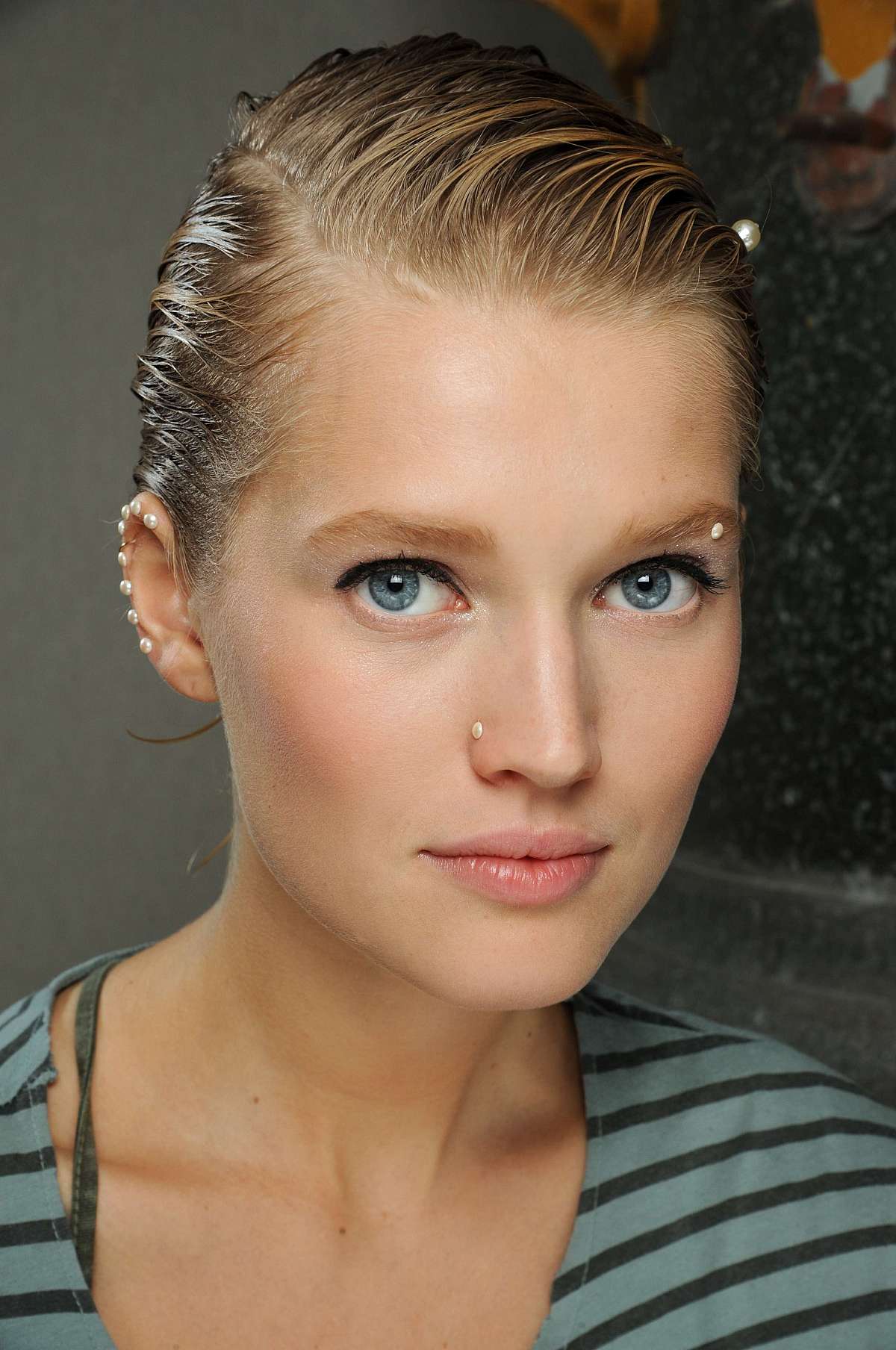 Wet look στα μαλλιά και αποτέλεσμα λάμψης στο μακιγιάζ. Τα χείλη είναι πάλι σε φυσικές αποχρώσεις.