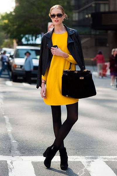 Με ένα chic φόρεμαTo κίτρινο είναι μια από τις πιο trendy νέες αποχρώσεις. Τολμήστε τη σε φόρεμα με μαύρο καλσόν (τουλάχιστον για την εποχή αυτή) και φορέστε από πάνω το ροκ biker τζάκετ σας. Γενικά, προσθέστε πάνω από καλά φορέματα και φούστες.