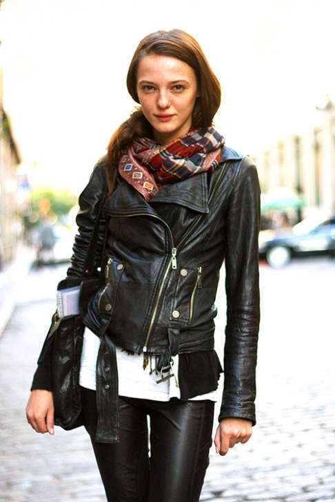 Πρόκειται για ένα πανωφόρι πασπαρτού με λαμπερή επιφάνεια που χαρίζει από μόνη της την αίσθηση της πολυτέλειας στο στυλ μας. Δεν χρειάζεται να είναι από αληθινό δέρμα απλά να έχει το κατάλληλο κόψιμο, τα zip και της αγκράφες που το κάνουν να φαίνεται πιο original. Δείτε διαφορετικούς τρόπους για να το φορέσετε σωστά. Σε ένα άσπρο-μαύρο σύνολοΤο πιο κλασικό χρώμα του biker jacket είναι χωρίς δεύτερη σκέψη το μαύρο. Συνδυάστε το με λευκό πουκάμισο και pencil μαύρη φούστα κι ένα ζευγάρι σέξι γόβες. Για ένα πιο δυναμικό look το αυστηρό χτένισμα είναι η καλύτερη επιλογή.