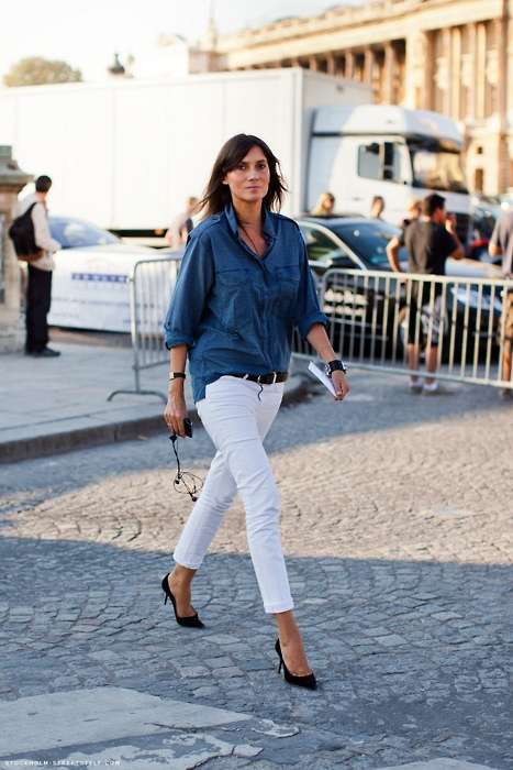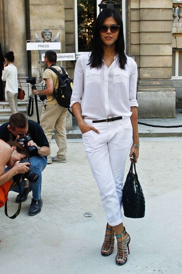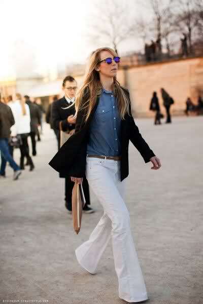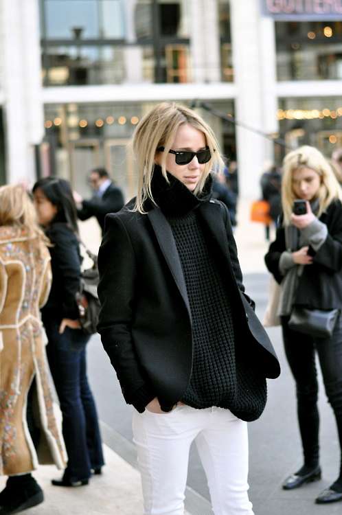 Διαφορετικά βάλτε το στη λίστα με τα κομμάτια πασπαρτού που μπορείτε να αγοράσετε τώρα και να το φορέσετε όλες τις εποχές. Ναι, μάλιστα όλες τις εποχές! Το ευγενές λευκό χρώμα στο παντελόνι δεν είναι μόνο για τους καλοκαιρινούς μήνες.Δείτε πως να το φορέσετε:Λευκό-μαύρο! Ο αγαπημένος συνδυασμός της μόδας σε χειμερινή casual εκδοχή με πρωταγωνιστή το λευκό τζιν σας. H Elin Kling το φοράει με άνετο πλεκτό μαύρο πουλόβερ και ένα κοντό μαύρο παλτό. Σωστή η επιλογή των Ray-Ban μαύρων γυαλιών. Skinny crop λευκό παντελόνι με τζιν πουκάμισο με γυρισμένα μανίκια και απλές μαύρες, μυτερές γόβες που δείχνουν ακόμα πιο όμορφο το πόδι.