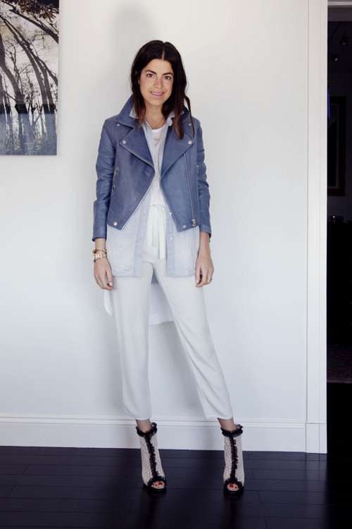 H blogger Man Repeller με λευκό ως βάση και τζιν χρώματα σε ένα layering (πουκάμισο, τζάκετ). Τα ψηλά παπούτσια προσθέτουν θηλυκότητα.