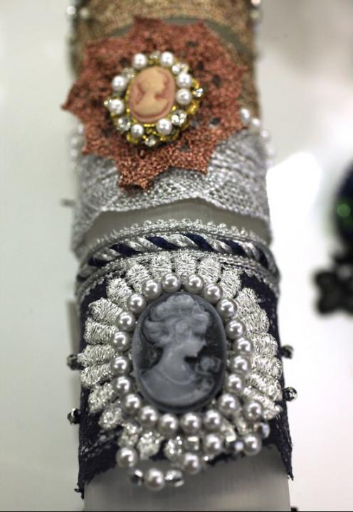 «Πάντα μου άρεσε να φτιάχνω πράγματα με τα χέρια μου. Ξεκουράζει το μυαλό ενώ παράλληλα σε βοηθάει να συγκεντρώνεις την προσοχή σου σ’ ένα αντικείμενο κάθε φορά και στο τέλος έχεις τη χαρά να βλέπεις το δημιούργημά σου. Έτσι, μετά από ψάξιμο στα άπειρα κουτάκια, συρτάρια, ντουλάπια με ξεχασμένα κουμπιά, δαντέλες, faux bijoux, κορδόνια αλλά και πολύχρωμες πέτρες – ημιπολύτιμες, λαμπερές, στρας, ξύλο ή παλιές από τα παζάρια της Ανατολής – που έχω κουβαλήσει από τα άπειρα ταξίδια μου, άρχισα να κεντώ δαντελένια βραχιόλια, να περνώ πέτρες σε κορδόνια, να προσθέτω αλυσίδες, στρας, φούντες, cameo, τρέσες και άλλα υλικά. Τα κοσμήματα άρεσαν στις φίλες μου που άρχισαν να μου φέρνουν διαφορά υλικά προς αξιοποίηση, από παλιές κεντημένες ζώνες μέχρι εντυπωσιακά κουμπιά που ξήλωναν από μαμαδίστικα ταγιέρ!»