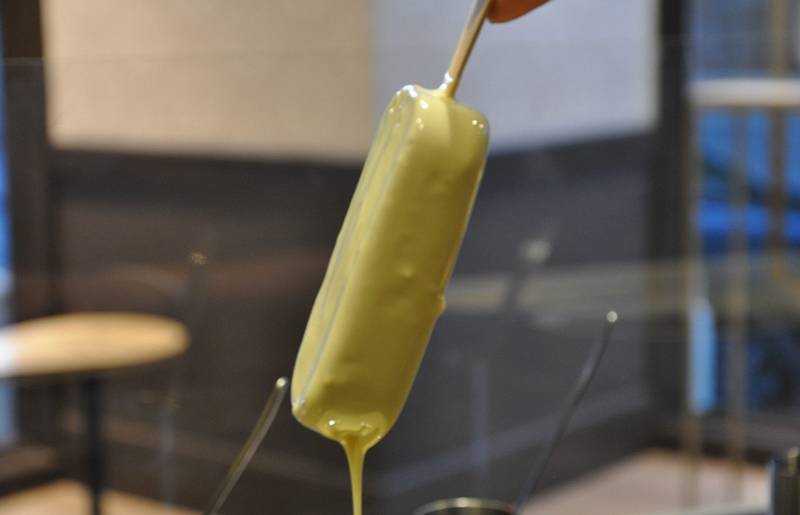 2. Διαλέξαμε τη γεύση του παγωτού, βανίλια ή σοκολάτα και στη συνέχεια την επικάλυψη -μαύρη σοκολάτα, λευκή ή γάλακτος.