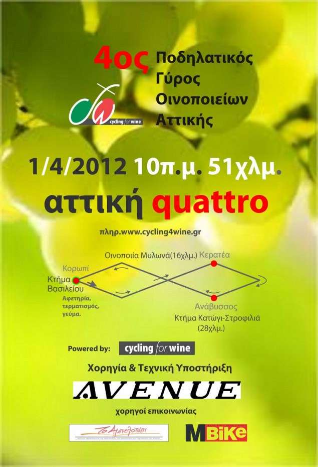 Κυριακή 1η Απριλίου 2012 στις 10 π.μ τον 4ο ποδηλατικό γύρο οινοποιών Αττικής μήκους 51 χιλιομέτρων προωθώντας με τον τρόπο αυτό την οινική παιδεία.Έχοντας ως αφετηρία το Κτήμα Βασιλείου, η πρώτη στάση θα είναι το οινοποιείο Μυλωνά στην Κερατέα μετά από 16 χιλιόμετρα θα καταλήξετε στο οινοποιείο της Στροφιλιάς στην Ανάβυσσο στα 28 χιλιόμετρα. Tέλος η επιστροφή και πάλι στο οινοποιείο του Γιώργου Βασιλείου θα περιλαμβάνει και ένα υπέροχο γεύμα για τους κουρασμένους ποδηλάτες.
