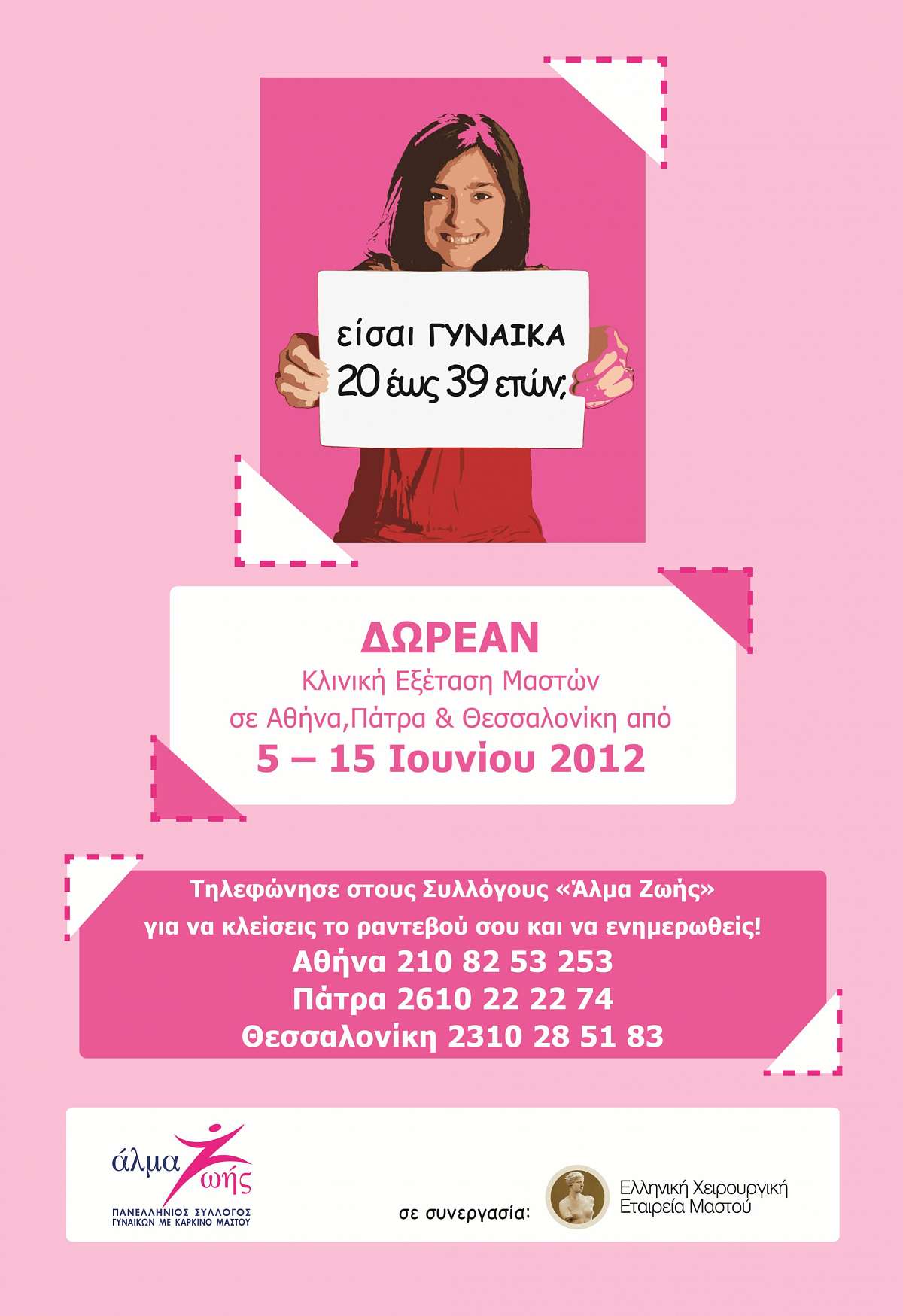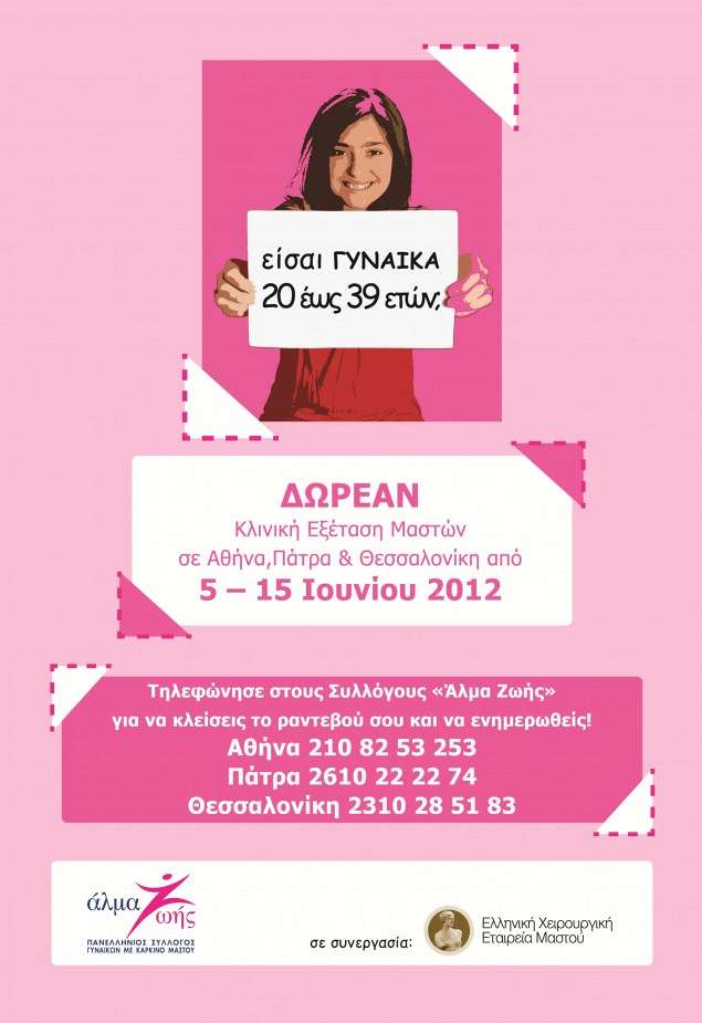 Δωρεάν κλινική εξέταση μαστού από 5 – 15 Ιουνίου 2012 για τις νέες γυναίκες από το «Άλμα Ζωής» σε Αθήνα, Πάτρα και Θεσσαλονίκη «Είσαι γυναίκα 20 έως 39 ετών; Μην έρθεις μαζί μας!».