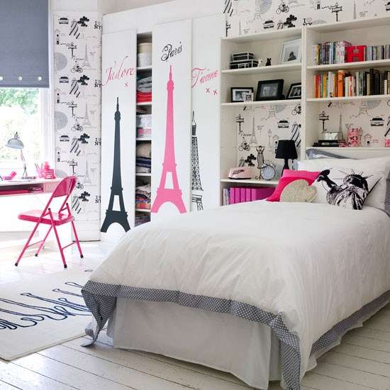 Η πρώτη σας κίνηση είναι να καταγράψετε τα έπιπλά που ήδη έχει. Εάν είναι από ένα παλιό ξύλο θα μπορούσατε να τα βάψετε λευκά και να μοιάζουν πιο παλιωμένα (ρωτήστε σχετικά στο χρωματοπωλείο). Σε γενικές γραμμές, καλό θα ήταν να ξεκινήστε από ένα λευκό καμβά γιατί αυτός είναι ο πιο ασφαλής κι εύκολος τρόπος να αποφύγετε τα στυλιστικά λάθη. Στη συνέχεια, πρέπει να σκεφτείτε το θέμα σας. Φύση, τοπία ή αγαπημένες πόλεις; Διαλέγει εκείνη. Τώρα η πιο εύκολη και αρκετά οικονομική λύση είναι τα αυτοκόλλητα. Είναι fun, έχουν χρώμα και καλύπτουν μεγάλες επιφάνειες υπακούοντας σε ένα συγκεκριμένο concept. Διαλέξτε στο λευκό καμβά που λέγαμε ποια χρώματα θα κυριαρχούν. Πρέπει να είναι τρία χρώματα-αδελφάκια για να υπάρχει συμφωνία αποχρώσεων! Μπορείτε να πάτε μετά σε ένα κατάστημα με οικονομικές τιμές και να αγοράσετε δύο-τρία πραγματάκια που πραγματικά θα το αλλάξουν: αυτό θα μπορούσε να είναι μια καρέκλα, μερικά μαξιλάρια, φωτιστικά ή ένα χαλάκι. Αλλάξτε παπλώματα και αδειάστε το δωμάτιο από όλα τα μικροπράγματα που κρατούν οι έφηβες από τα παιδικά τους χρόνια.