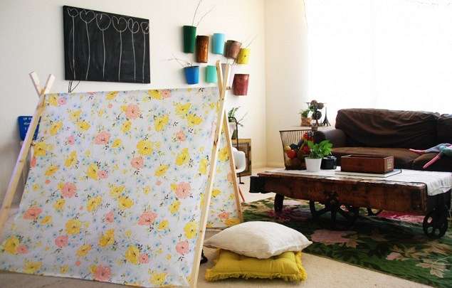 Μερικά ξύλα, ένα όμορφο πανί που θα διαλέξετε με το παιδί σας και μερικές τρύπες και βίδες και η χειροποίητη σκηνή εσωτερικού χώρου είναι έτοιμη!