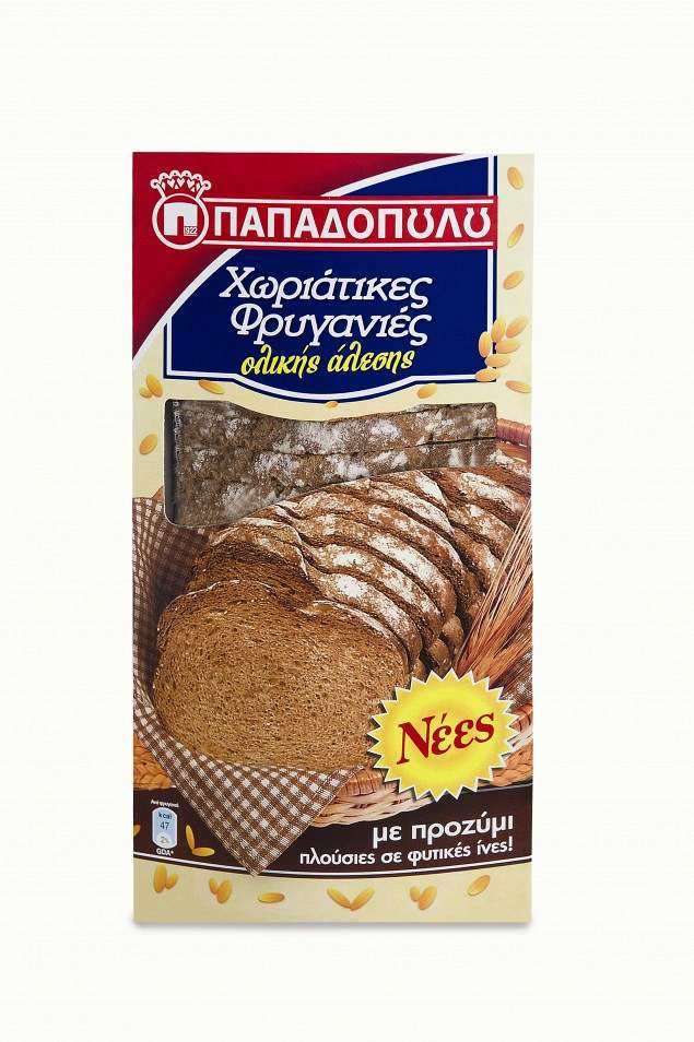 - Μπόλικες χωριάτικες φρυγανιές ολικής άλεσης με προζύμι, Παπαδοπούλου που έχουν όλη τη θρεπτική αξία των δημητριακών ολικής άλεσης είναι πλούσιες σε φυτικές ίνες, και περιέχουν 75% αλεύρι ολικής άλεσης. Ιδανικές με βούτυρο και μέλι, μαρμελάδα, φυστικοβούτυρο αλλά και με κασέρι εάν σας αρέσουν οι αλμυρές γεύσεις το πρωί.